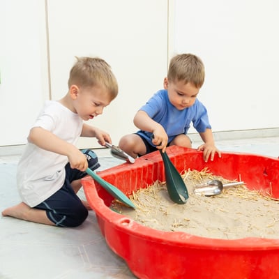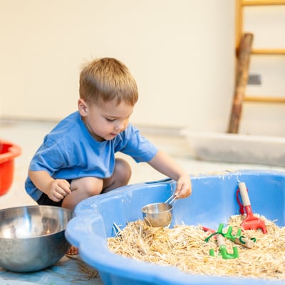 - Im Oberstock gibt es unterschiedliche Sensorikwannen, wo mit allen Sinnen unterschiedliche Materialien erleben können (Heu, Stroh, Sägespähne, Kastanien, Sand, etc.).