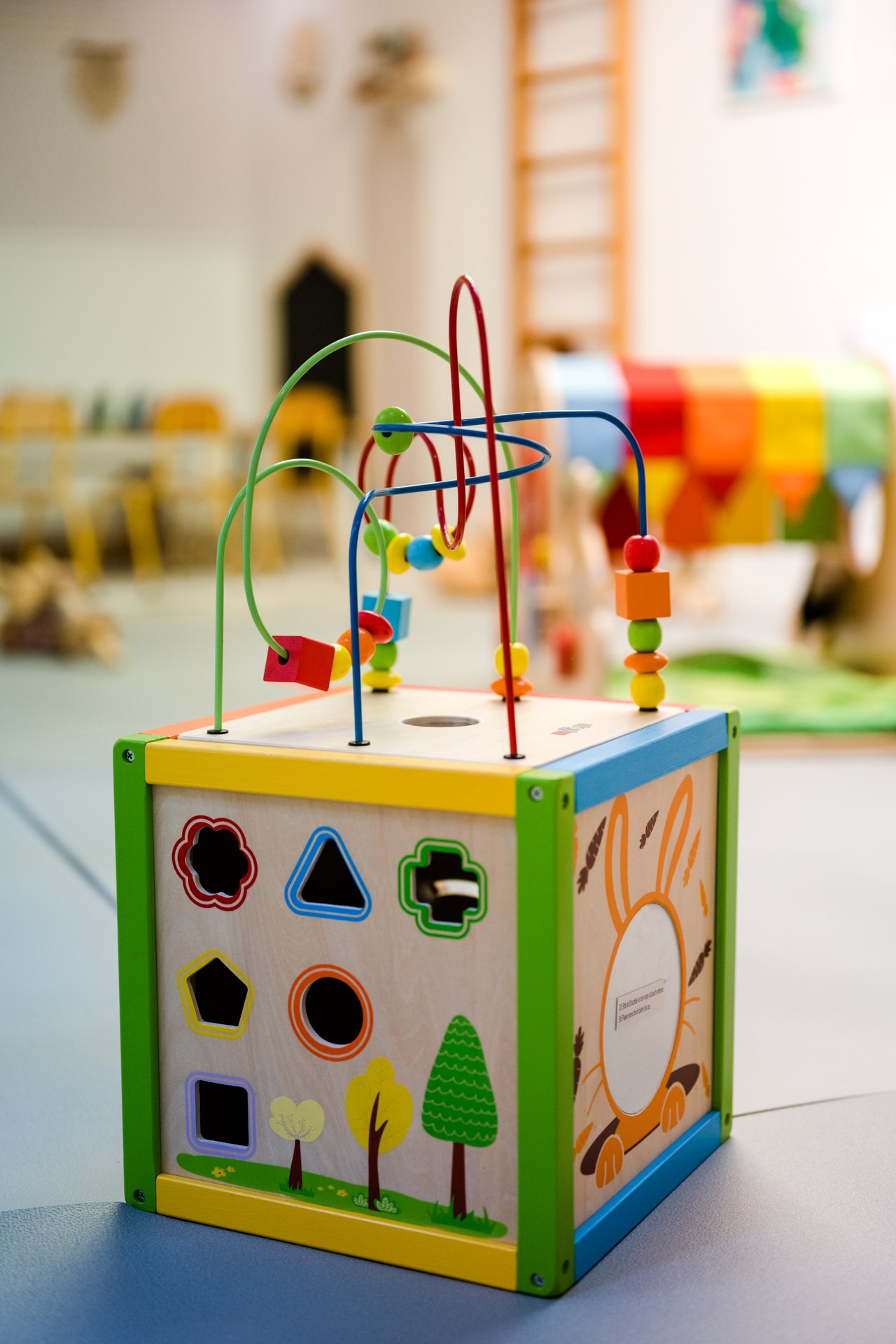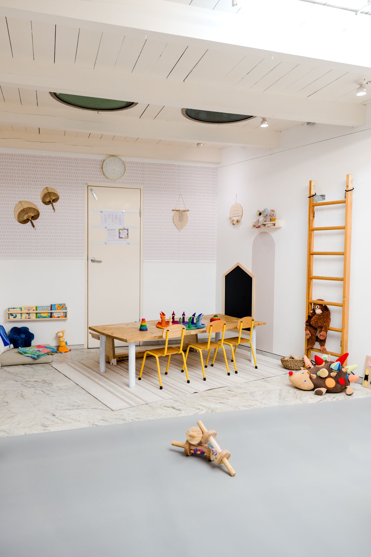 Motorikschleifen, Kugelbahnen und ein bruchsicherer Spiegel machen schon den Kleinsten Freude. Unsere schadstofffreien Holzspielsachen regen alle Sinne an. Wir musizieren mit Instrumenten, klettern auf unsere Sprossenwand, balancieren auf Holzwegen und kraxeln über den Pikler-Bogen.