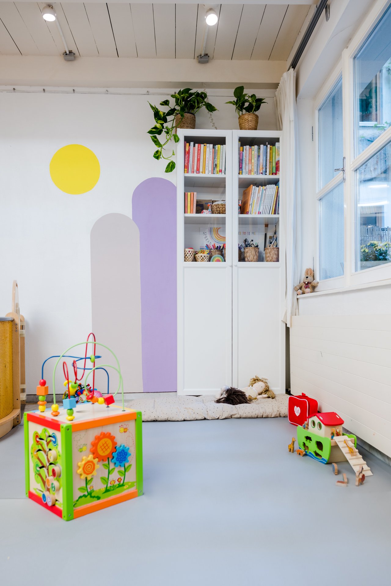 Durch unsere Fußbodenheizung, können wir selbst in der kalten Jahreszeit mit allen Sinnen und dem ganzen Körper Farben und Konsistenzen erkunden.
